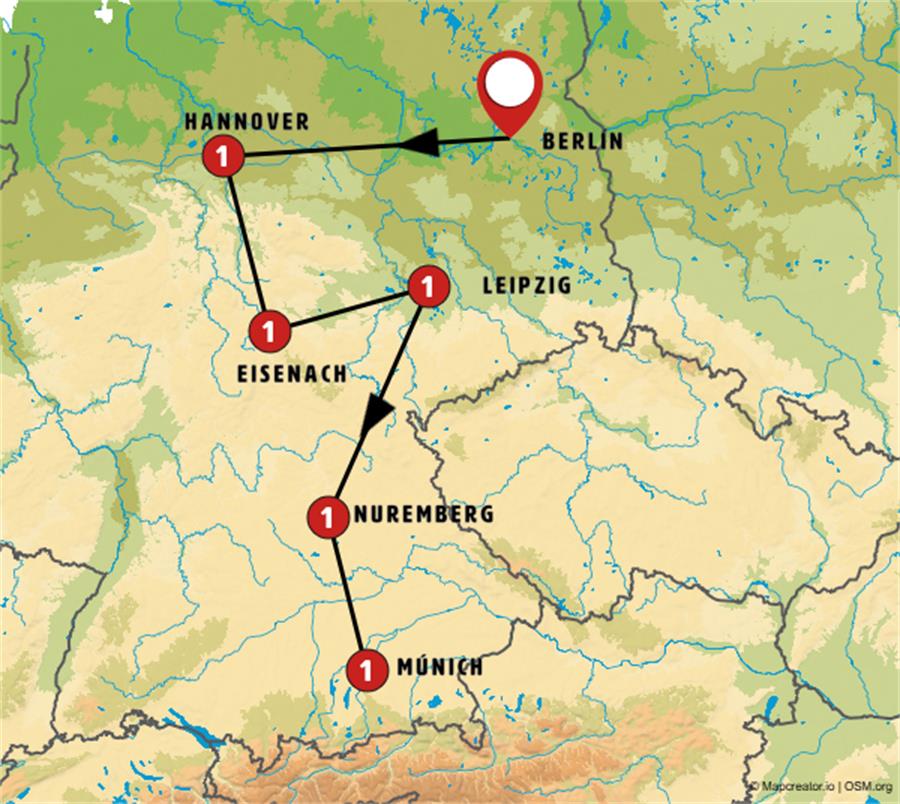 BERLIN, WOLFSBURGO, CELLE, HANNOVER, GOSLAR, GOTINGA, BAD SOODEN, EISENACH, GOTHA, ERFURT, LEIPZIG, DRESDE, BAMBERG, NUREMBERG, KLOSTER WELTENBURG, DACHAU, MUNICH