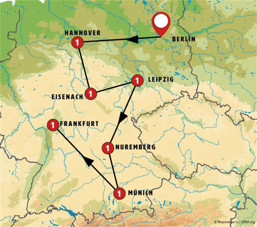BERLÍN, WOLFSBURGO, CELLE, HANNOVER, GOSLAR, GOTINGA, BAD SOODEN, EISENACH, GOTHA, ERFURT, LEIPZIG, DRESDE, BAMBERG, NUREMBERG, KLOSTER WELTENBURG, DACHAU, MÚNICH, FUSSEN, ROTEMBURGO, FRANKFURT