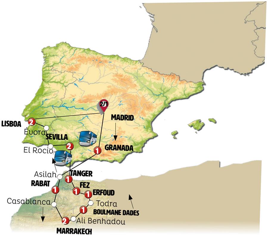 MADRID, GRANADA, TÁNGER, ARCILA, RABAT, CASABLANCA, MARRAKECH, KSAR DE AIT BEN HADU, OUARZAZATE, BOUMALNE DADES, TODRA, ERFOUD, FEZ, SEVILLA, MÉRIDA, ÉVORA, LISBOA, CÁCERES