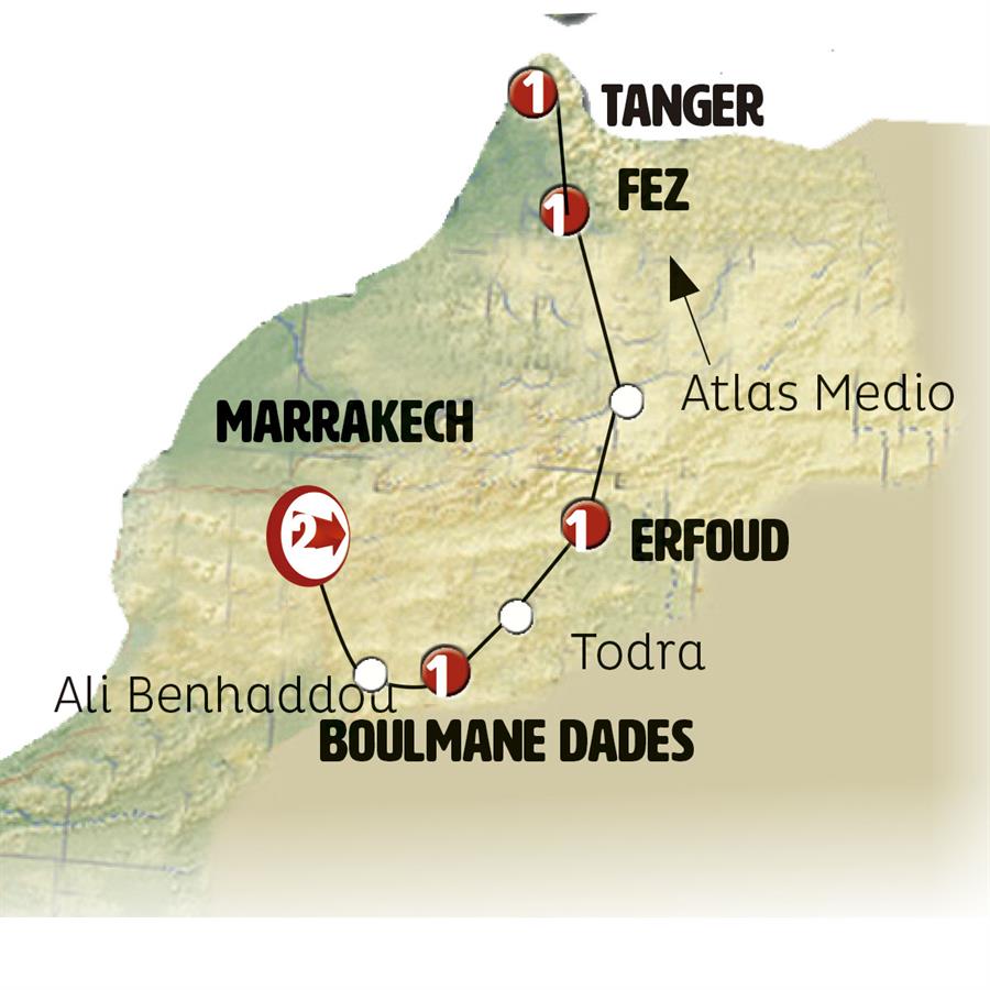 MARRAKECH, KSAR DE AIT BEN HADU, OUARZAZATE, BOUMALNE DADES, TODRA, ERFOUD, FEZ, TÁNGER