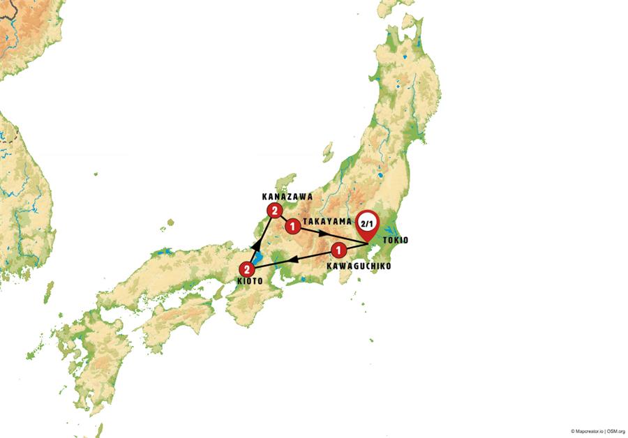 TOKIO, MONTE FUJI, KAWAGUCHIKO, IYASHI NO SATO NEMBA, TOYOTA, KIOTO, EIHEI-JI, KATSUYAMA-MUSEO DE LOS DINOSAURIOS, KATSUYAMA, KANAZAWA, AINOKURA, SHIRAKAWAGO, ALDEA DE HIDA, TAKAYAMA, HIDA FURUKAWA, MATSUMOTO