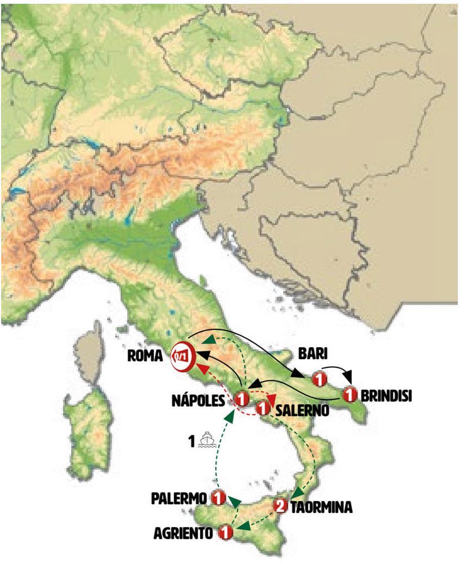 ROMA, ABADIA SAN GIOVANNI IN VENERE, TERMOLI, BARI, BRINDISI, LECCE, GALLIPOLI, ALBEROBELLO, MATERA, NAPOLES, CAPRI, SORRENTO, SALERNO, PAOLA, MESINA, TAORMINA, GIARDINI NAXOS, VILLA ROMANA DEL CASALE, PALERMO