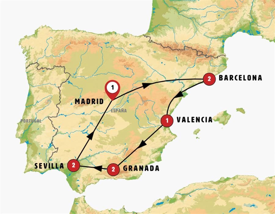 MADRID, ZARAGOZA, POBLET, BARCELONA, PEÑÍSCOLA, VALENCIA, ALICANTE, GUADIX, GRANADA, NERJA, MÁLAGA, RONDA, SEVILLA, CÓRDOBA, CONSUEGRA