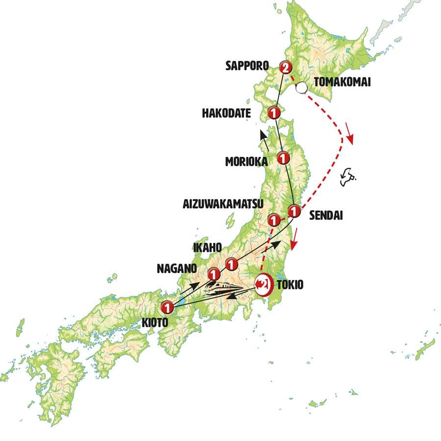 TOKIO, KIOTO, TSUMAGO, MATSUMOTO, NAGANO, PARQUE DE LOS MONOS, KUSATSU, IKAHO, NIKKO, SENDAI, MATSHUSHIMA, HIRAIZUMI, MORIOKA, HIROSAKI, AOMORI, HAKODATE, ONUMA, NOBORIBETSU, SAPPORO, TOYAKO ONSEN, MONTE USU, FERRI TOMAKOMAI SENDAI, YAMADERA, AIZUWAKAMATSU, OUCHIJUKU