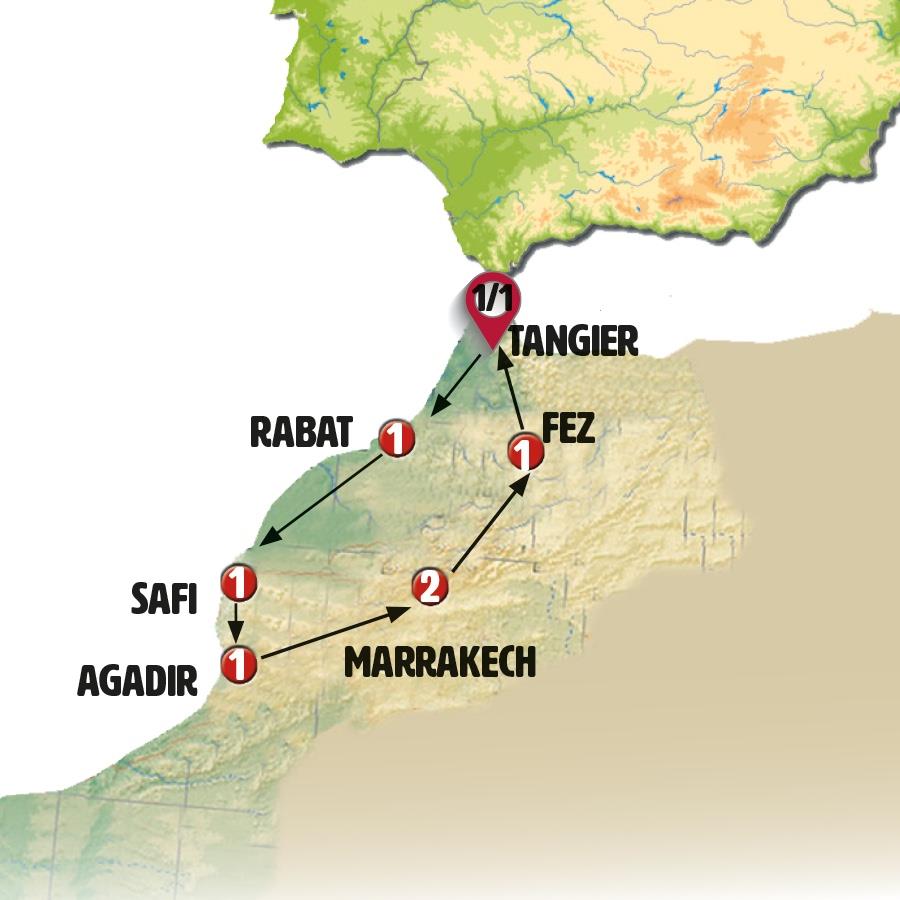 TÁNGER, ARCILA, RABAT, CASABLANCA, EL YADIDA, SAFÍ, ESAUIRA, AGADIR, MARRAKECH, OUZOUD, FEZ