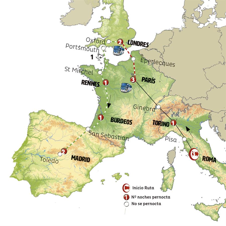PARÍS, BORGOÑA, BEAUNE, LYON, GINEBRA, MILÁN, VENECIA, RAVENA, ASÍS, ROMA, FLORENCIA, PISA, SESTRI LEVANTE, MONTECARLO, COSTA AZUL, ARLES, BARCELONA, PENEDÉS, ZARAGOZA, MADRID, GRANADA, NERJA, MÁLAGA, RONDA, SEVILLA, MÉRIDA, ÉVORA, LISBOA
