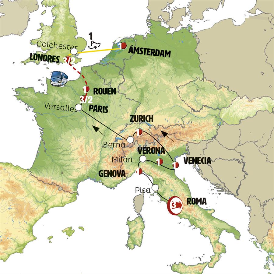 ROMA, PISA, SANTA MARGHERITA LIGURE, PORTOFINO, GÉNOVA, SAN GIULIO, MILÁN, VERONA, VENECIA, LUGANO, LUCERNA, ZÚRICH, ESTRASBURGO, PARÍS, ROUEN, CANAL DE LA MANCHA, CANTERBURY, LONDRES, COLCHESTER, FERRI COLCHESTER - VOLENDAM, VOLENDAM, ÁMSTERDAM