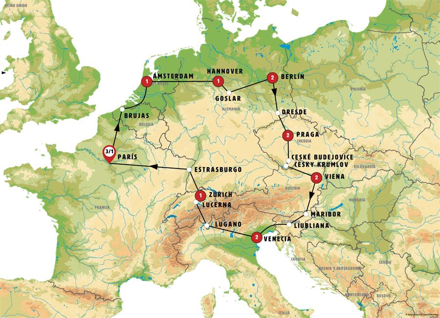 PARÍS, BRUJAS, ÁMSTERDAM, HANNOVER, GOSLAR, BERLÍN, DRESDE, PRAGA, CESKÉ BUDEJOVICE, CESKY KRUMLOV, VIENA, MARIBOR, LIUBLIANA, VENECIA, LUGANO, LUCERNA, ZÚRICH, ESTRASBURGO