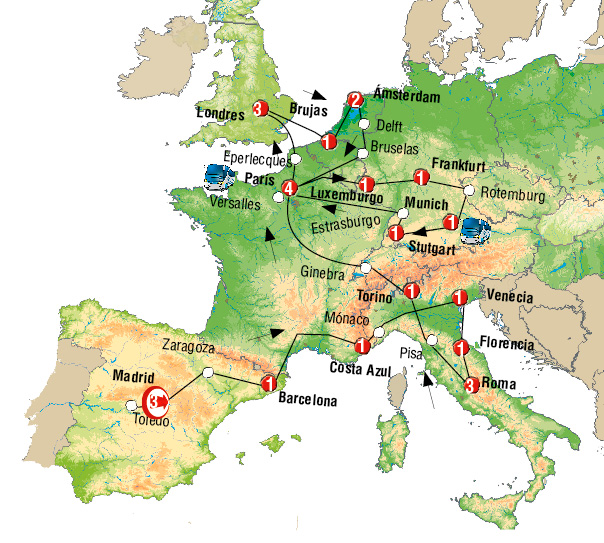 MADRID, SAN SEBASTIAN, BURDEOS, CHAMBORD, PARIS, BOUILLON, LUXEMBURGO, COCHEM, CRUCERO POR EL RHIN, FRANKFURT, ROTEMBURGO, MUNICH, SALZBURGO, ST. WOLFGANG, LAGO TRAUNSEE, VIENA, BRATISLAVA, TRENCIN, CRACOVIA, AUSCHWITZ, CZESTOCHOWA, VARSOVIA, WROCLAW, PRAGA, LEDNICE, BUDAPEST, REGION DE CARINTIA, VENECIA, RAVENA, ASIS, ROMA, FLORENCIA, PISA, SESTRI LEVANTE, MONTECARLO, COSTA AZUL, ARLES, BARCELONA, COMARCA DEL PENEDES, ZARAGOZA