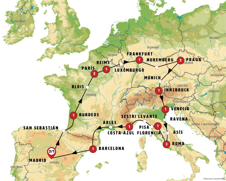 MADRID, SAN SEBASTIÁN, BURDEOS, BLOIS, PARÍS, REIMS, LUXEMBURGO, FRANKFURT, ROTEMBURGO, NUREMBERG, PRAGA, MÚNICH, INNSBRUCK, VENECIA, RAVENA, ASÍS, ROMA, FLORENCIA, PISA, SESTRI LEVANTE, MONTECARLO, COSTA AZUL, ARLES, BARCELONA