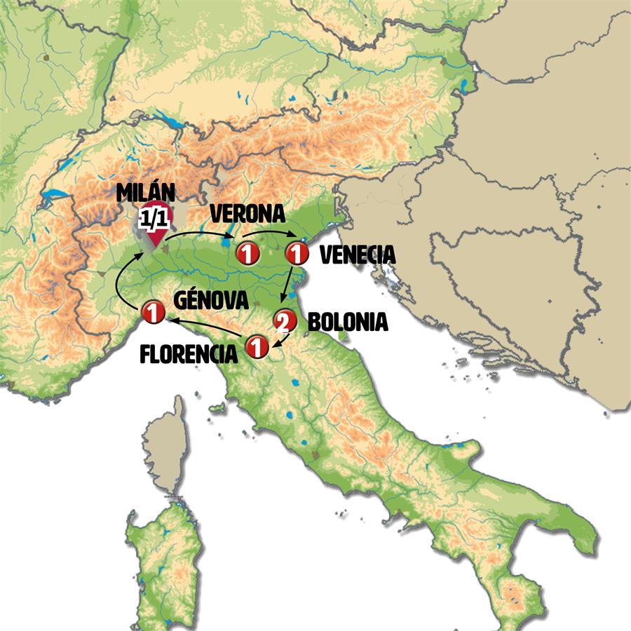 MILAN, REGION DE LOS LAGOS, VERONA, VENECIA, FERRARA, MODENA, BOLONIA, FLORENCIA, PISA, CINQUE TERRE, GENOVA, PORTOFINO