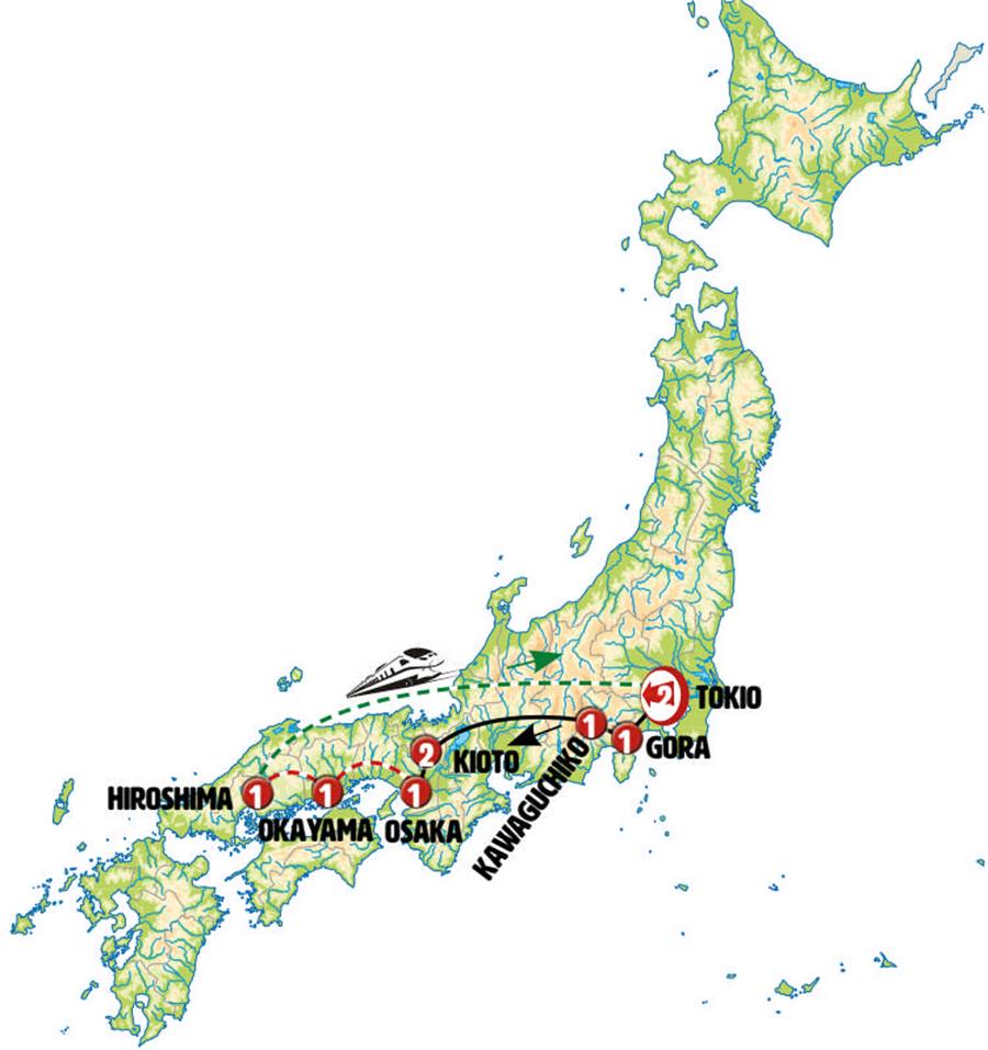 TOKIO, KAMAKURA, ENOSHIMA, ODAWARA, MONTE FUJI, KAWAGUCHIKO, IYASHI NO SATO NEMBA, TOYOTA, KIOTO, NARA, OSAKA, HIMEJI, JARDINES DE KORAKUEN, OKAYAMA, KURASHIKI, ITSUKUSHIMA, HIROSHIMA