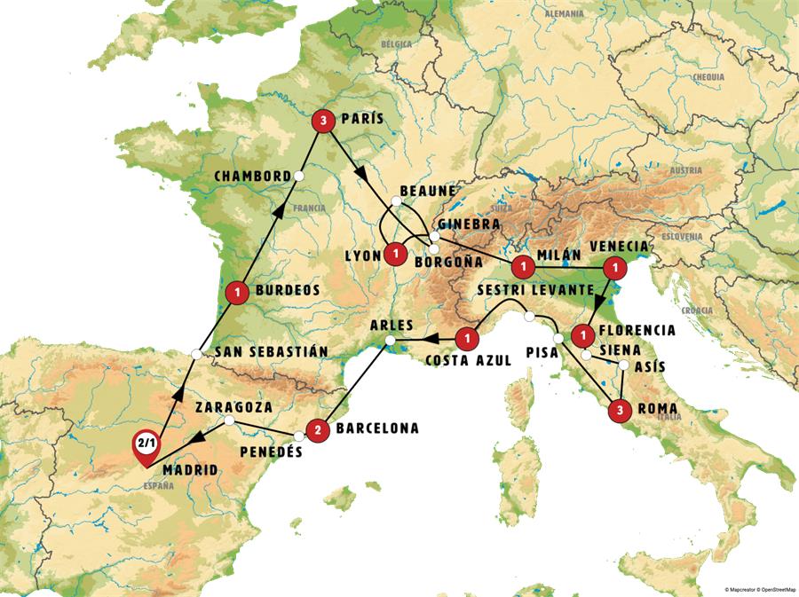 MADRID, SAN SEBASTIÁN, BURDEOS, CHAMBORD, PARÍS, BORGOÑA, BEAUNE, LYON, GINEBRA, MILÁN, VENECIA, FLORENCIA, SIENA, ASÍS, ROMA, PISA, SESTRI LEVANTE, COSTA AZUL, ARLES, BARCELONA, PENEDÉS, ZARAGOZA