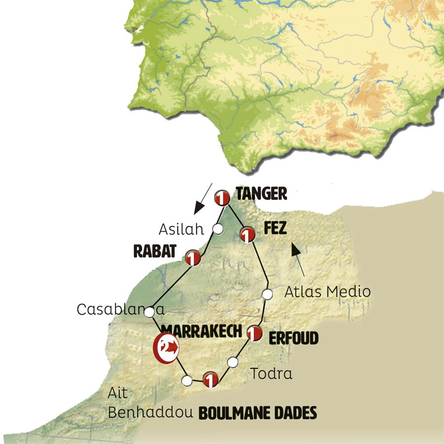 MARRAKECH, AIT BEN HADU, OUARZAZATE, BOUMALNE DADES, TODRA, ERFOUD, FEZ, TANGER, ASSILAH, RABAT, CASABLANCA