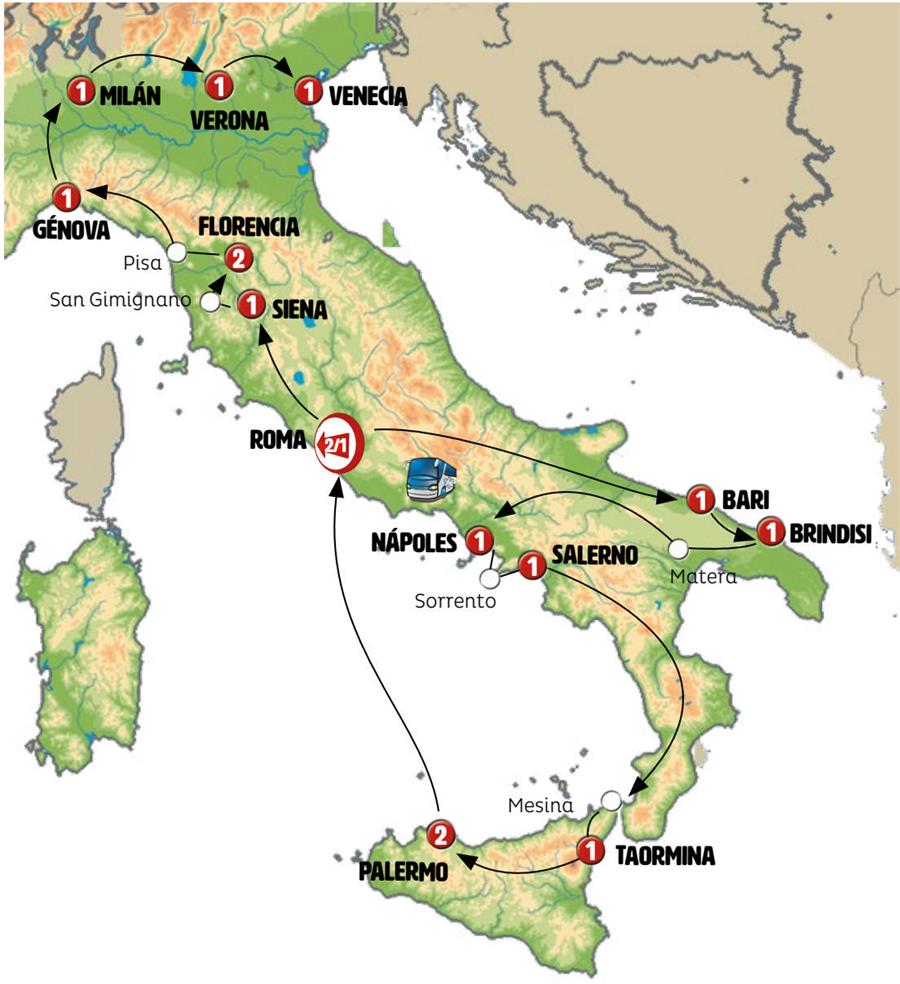 ROMA, ABADIA SAN GIOVANNI IN VENERE, TERMOLI, BARI, BRINDISI, LECCE, GALLIPOLI, ALBEROBELLO, MATERA, NAPOLES, CAPRI, SORRENTO, SALERNO, PAOLA, MESINA, TAORMINA, GIARDINI NAXOS, VILLA ROMANA DEL CASALE, PALERMO, ORVIETO, CASTIGLIONE DEL LAGO, SIENA, MONTERIGGIONI, SAN GIMIGNANO, FLORENCIA, PISA, CINQUE TERRE, GENOVA, PORTOFINO, MILAN, REGION DE LOS LAGOS, VERONA, VENECIA