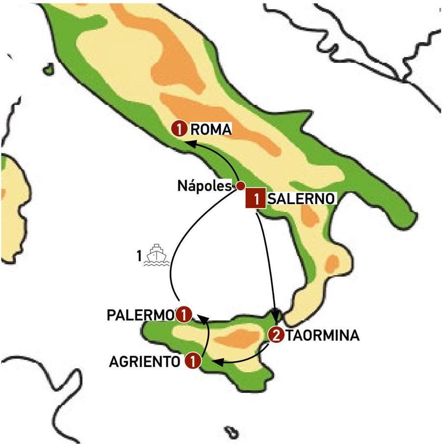 ROMA, NAPOLES, CAPRI, SORRENTO, SALERNO, PAOLA, MESINA, TAORMINA, CATANIA, VILLA ROMANA DEL CASALE, AGRIGENTO, MARSALA, ERICE, PALERMO, MONREALE, FERRI PALERMO NAPOLES, POMPEYA