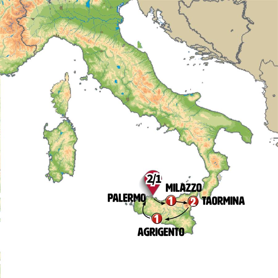 PALERMO, CEFALU, CASTELBUONO, TINDARIS, MILAZZO, VULCANO, LIPARI, TAORMINA, CATANIA, SIRACUSA, AGRIGENTO, MARSALA, ERICE