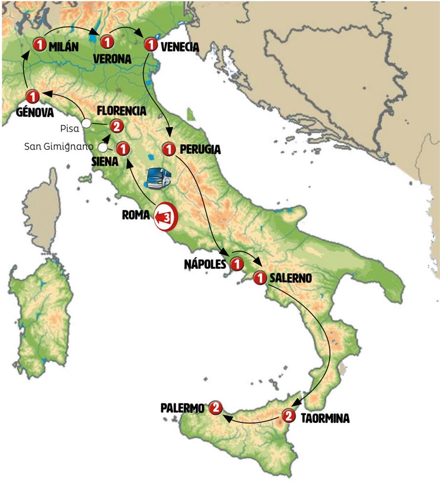 ROMA, ORVIETO, CASTIGLIONE DEL LAGO, SIENA, MONTERIGGIONI, SAN GIMIGNANO, FLORENCIA, PISA, CINQUE TERRE, GENOVA, PORTOFINO, MILAN, REGION DE LOS LAGOS, VERONA, VENECIA, PADUA, SAN MARINO, GUBBIO, PERUGIA, ASIS, NAPOLES, CAPRI, SORRENTO, SALERNO, PAOLA, MESINA, TAORMINA, GIARDINI NAXOS, VILLA ROMANA DEL CASALE, PALERMO