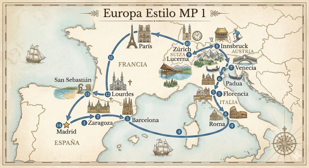 Vive un recorrido completo por España, Italia, Austria, Suiza y Francia en un circuito de 18 días que reúne las ciudades más emblemáticas de Europa. El viaje inicia y finaliza en Madrid, avanzando por destinos llenos de historia como Zaragoza y Barcelona, para luego conectar con la grandeza artística de Roma, Florencia, Padua y Venecia. La ruta continúa hacia los Alpes con la belleza natural de Innsbruck, Lucerna y Zúrich, antes de llegar a la elegancia y romanticismo de París. El itinerario se completa con la espiritualidad de Lourdes y el encanto del norte español en San Sebastián. Este programa incluye el Paquete Plus, con comidas seleccionadas, visitas guiadas, entradas destacadas como Museos Vaticanos, Góndola en Venecia, Torre Eiffel y Bateaux Mouche, además de traslados, guía acompañante y servicios Mapaplus que garantizan comodidad y una experiencia europea inolvidable.